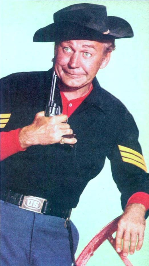 Forrest Tucker as Sgt. O’Rourke in “F-Troop.” That’s pretty poor muzzle discipline, Sarge.